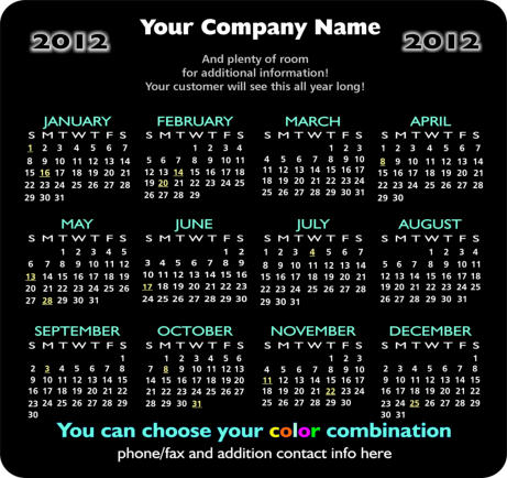 We will help you create your own customized calendar on a soft top or hard top mouse pad. You choose the colors, picture(s). We’ll also add your logo and information..... the prices below include the art layout!